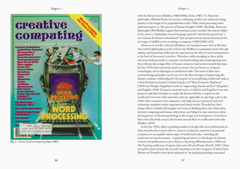 ‘This dissertation examines the archeology of computing’s integration with everyday life by examining transformations across Cultures of Use (CoU) within the period between the 1970s and 1980s, when computing moved out of organizations and into our homes and our everyday lives. It argues for the importance of switching perspective on the (media) history of computing, not departing from an assumption of computer technological media as organizational centers, but starting with the analysis and juxtaposition of CoU as historical actor-networks that in varying ways connected computing machinery with its human, economical, political, and ideological surroundings. The main thesis of the dissertation is organized around three case studies (word processing; problem solving; online searching) that all evidence that the history of a contemporary entwinement of computing with the lives of human individuals is caught up with a complex set of culturally and historically specific processes involving multiple facets of transformation.’